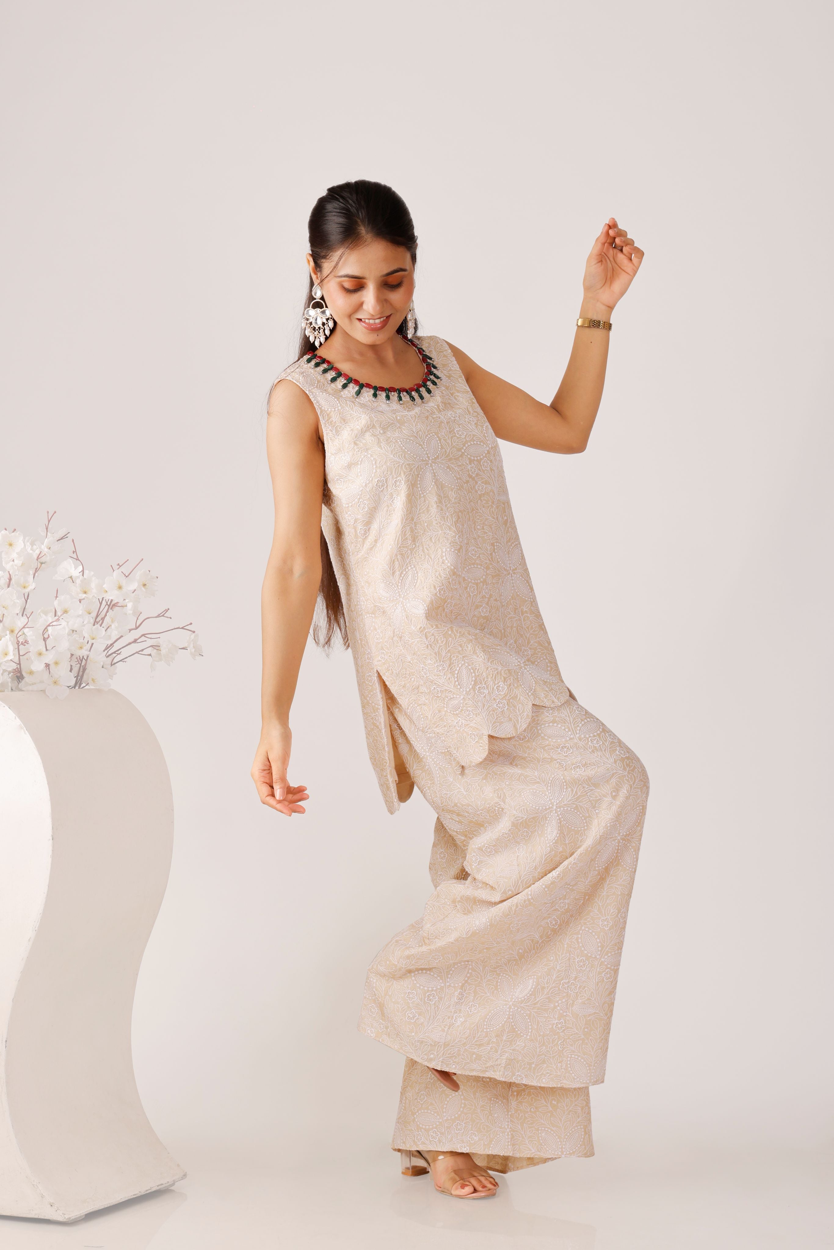 The Beige Coord Set is the perfect fusion of understated elegance and traditional artistry. Crafted in delicate tissue fabric, this two-piece ensemble embodies grace and comfort, making it a versatile choice for multiple occasions.