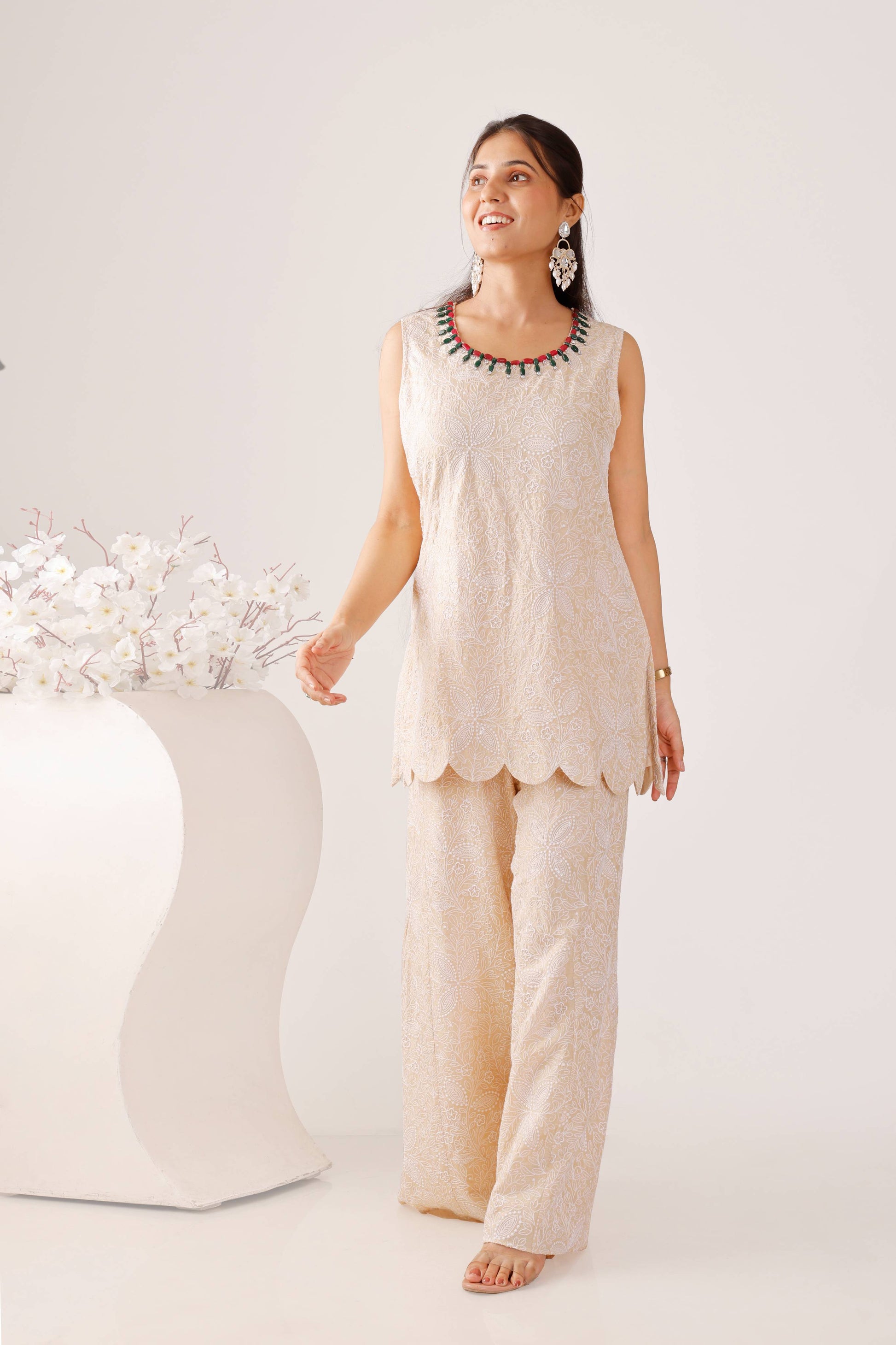 This coord set highlights a neutral beige tone that radiates sophistication. The Chikankari embroidery adds a touch of timeless handcraft, while the flared pants create a flowing silhouette that flatters all body types. The embellished neckline serves as a striking focal point, balancing simplicity with subtle glamour.