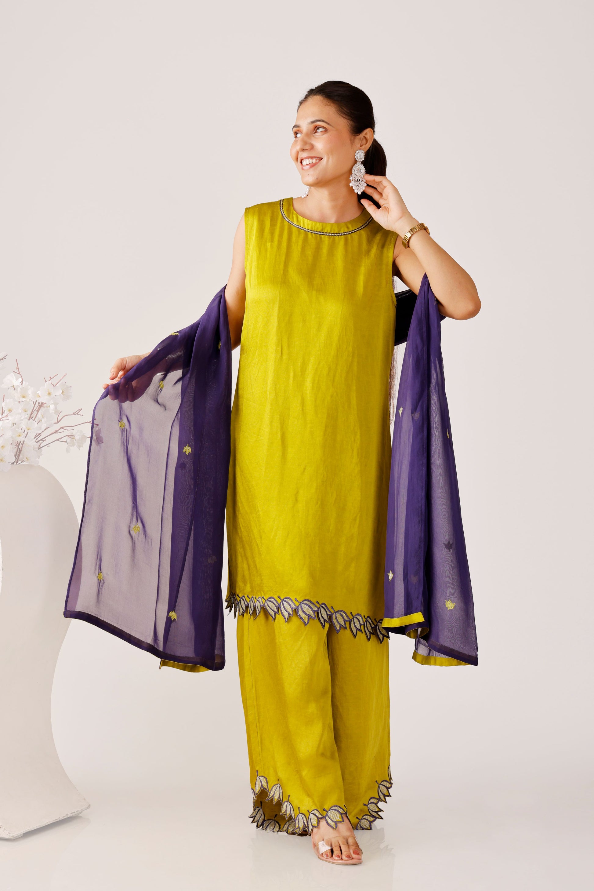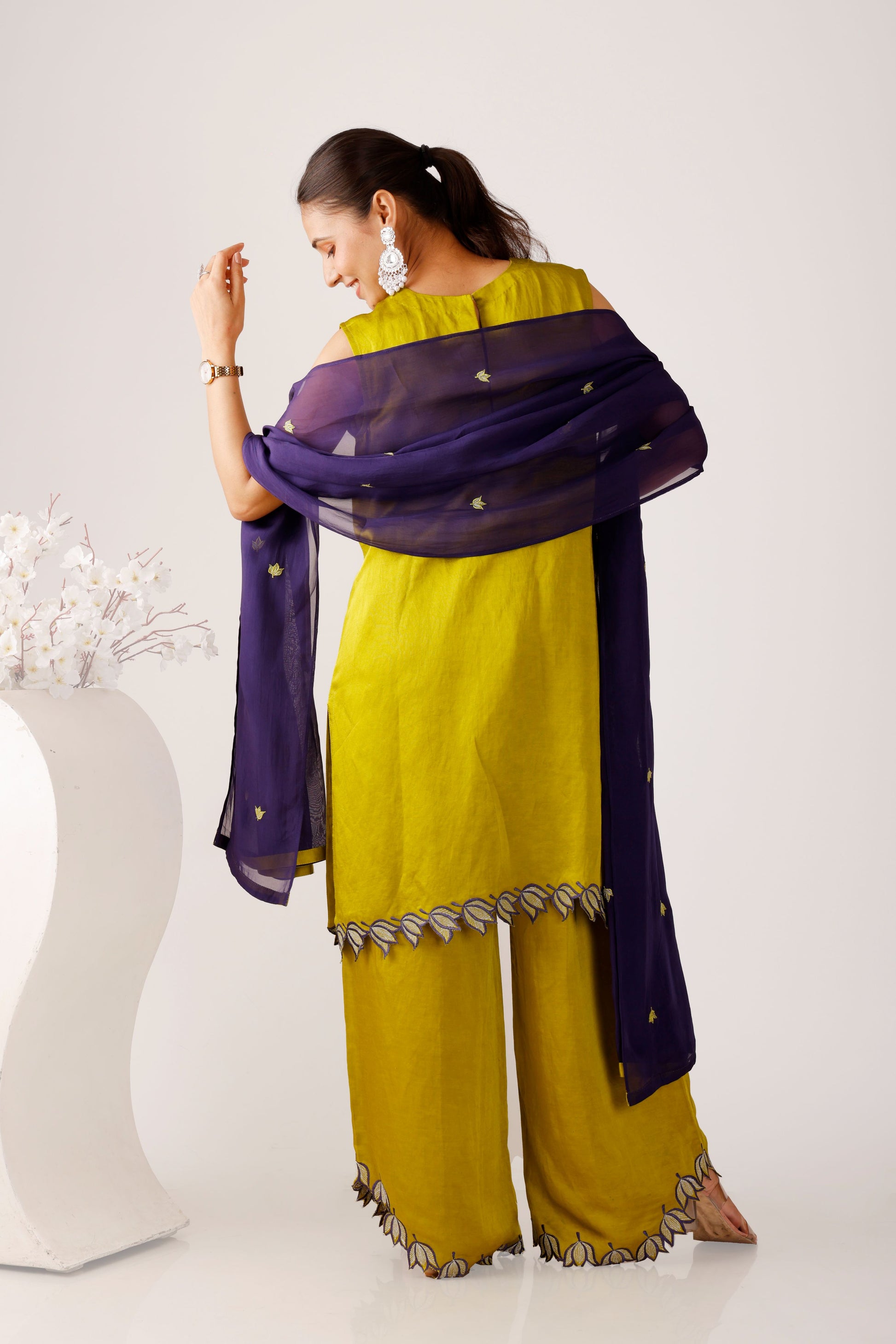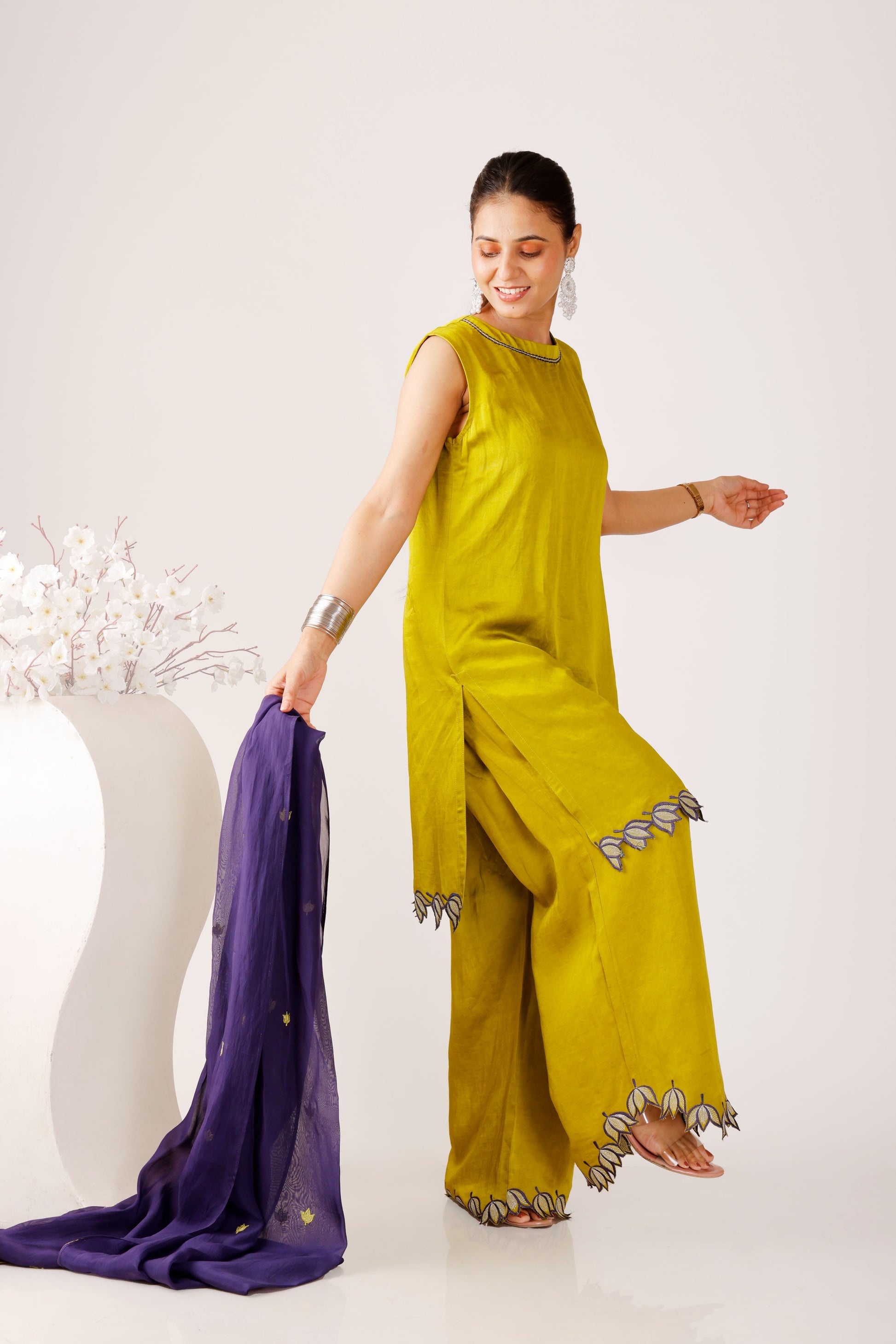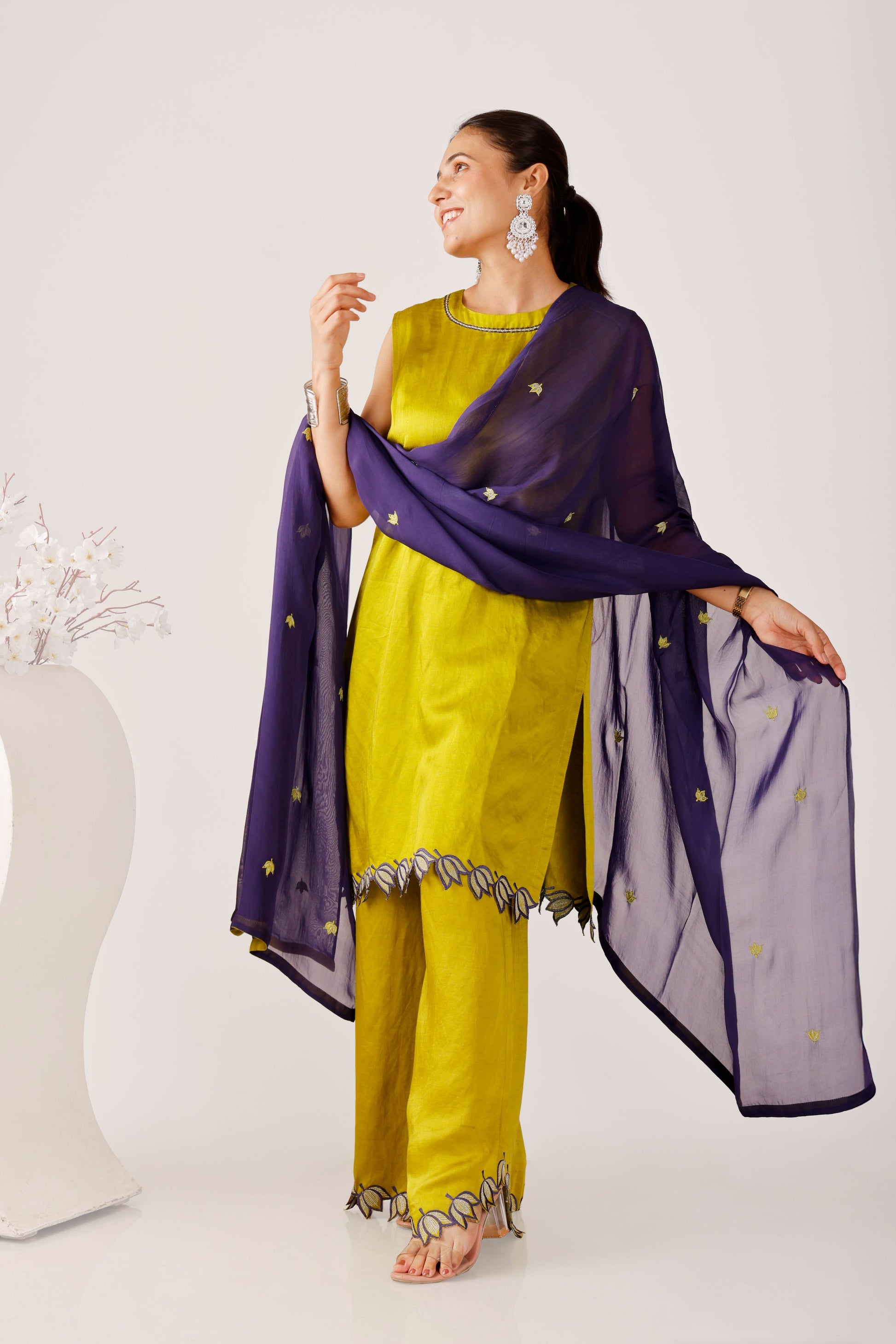 The outfit showcases a graceful green silhouette with a relaxed palazzo, offering comfort and sophistication with every step. The true highlight lies in the purple and silver kasab embroidery, forming intricate upside-down lotus motifs that shimmer with regal charm. The organza dupatta, adorned with exquisite detailing, completes the look with an air of effortless elegance.