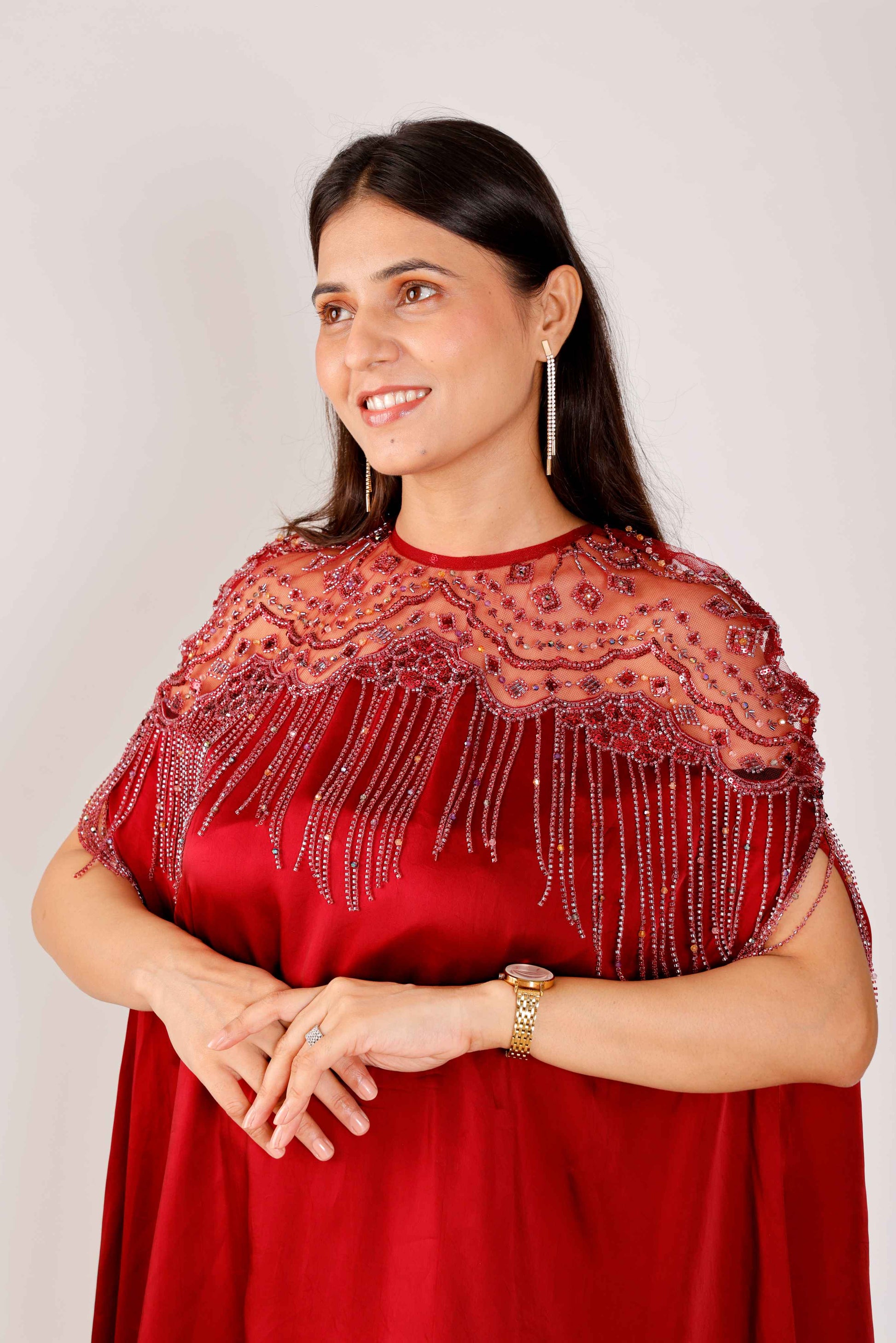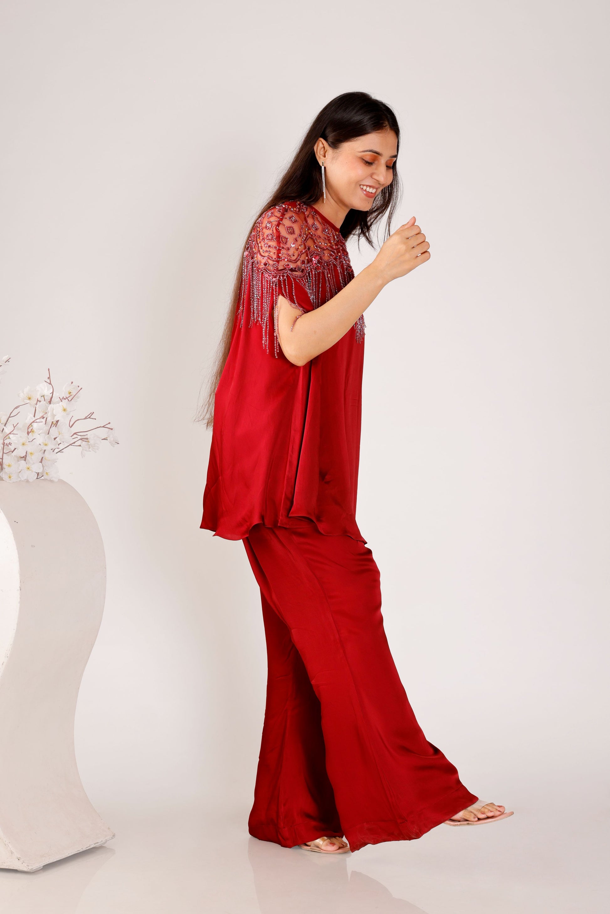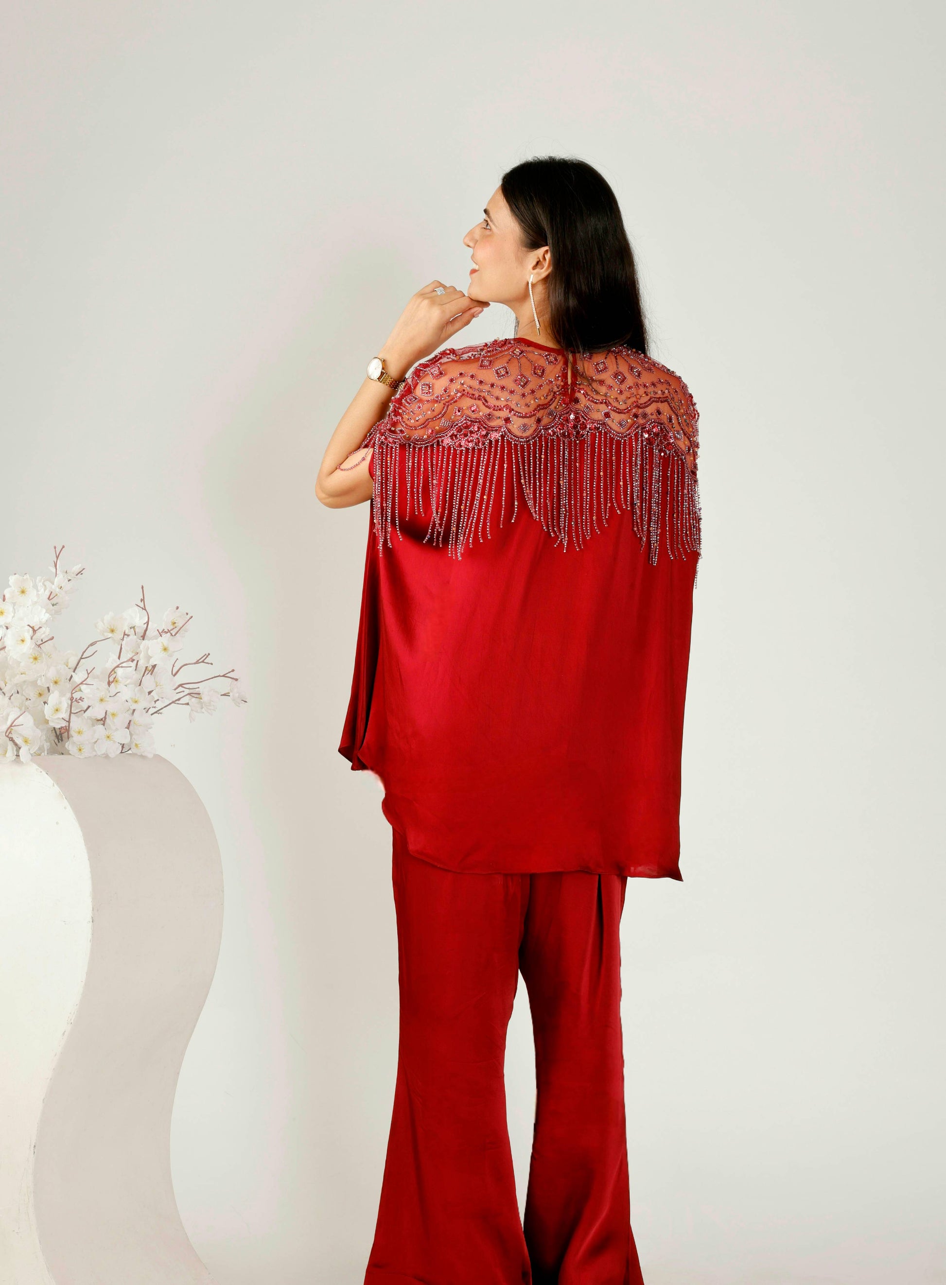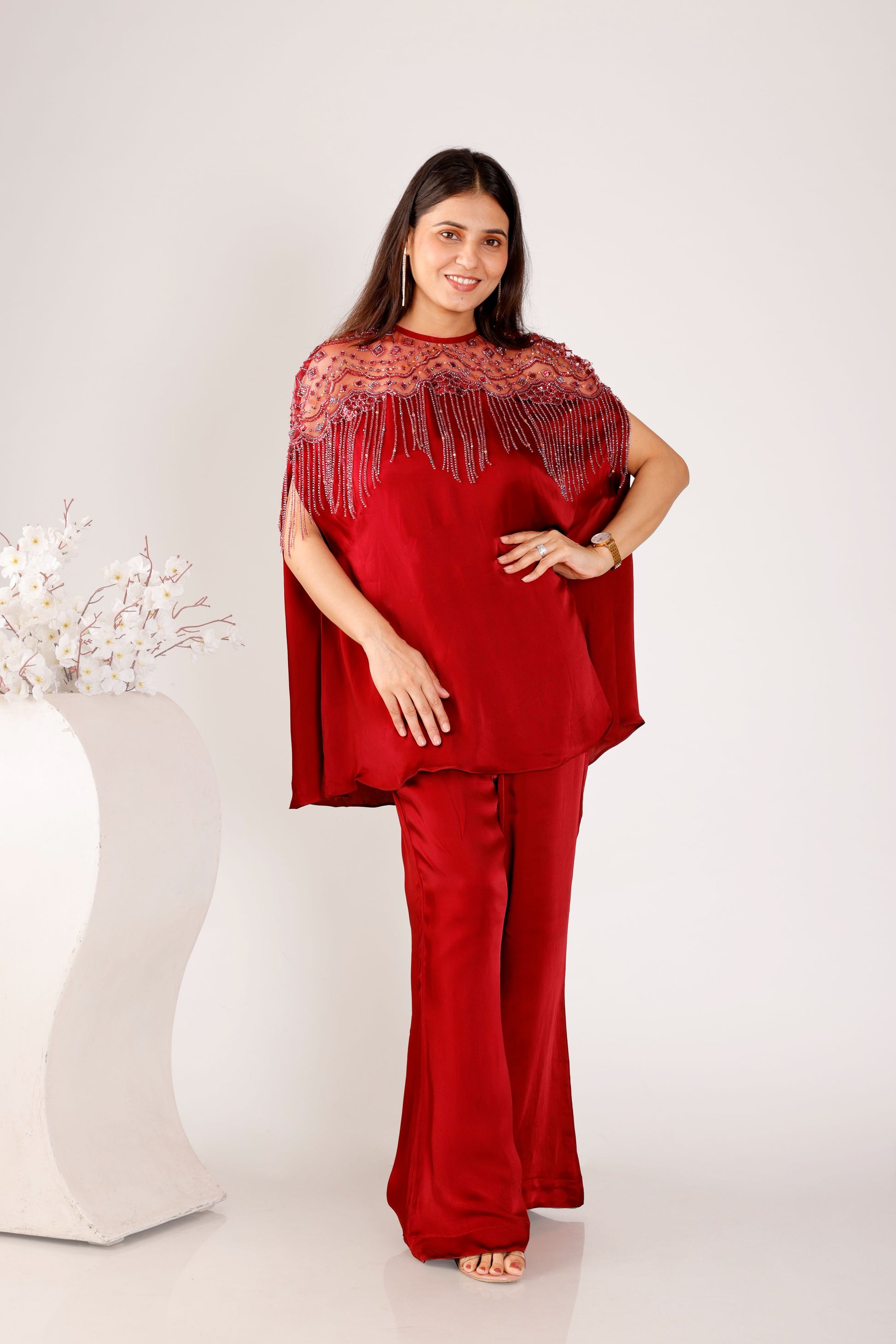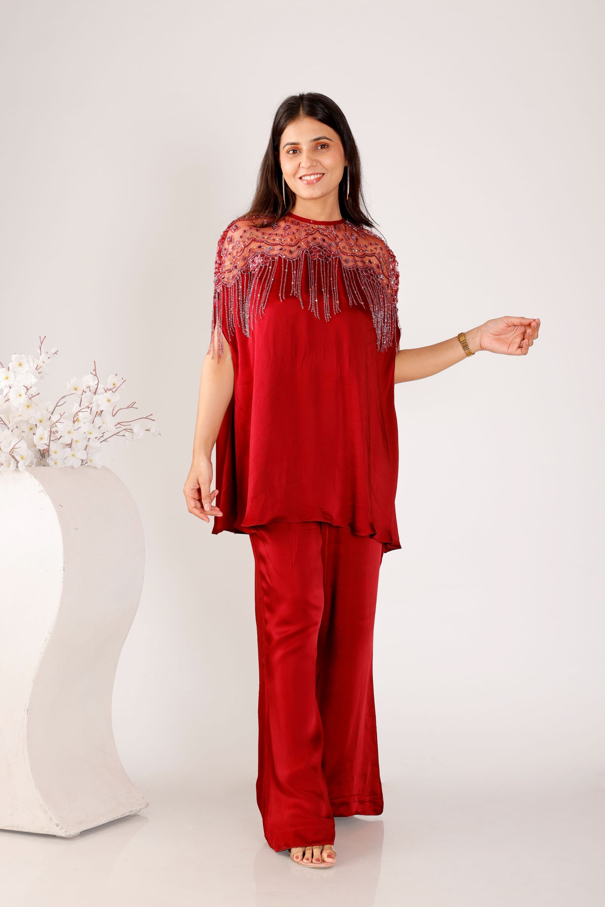 This statement outfit showcases a cape-style silhouette adorned with intricate neckline embellishments that exude sophistication. The deep maroon hue enhances its regal charm, while the monochrome pants bring balance and a polished appeal.Why You’ll Love It: